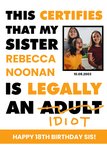 "This certifies that my brother Rebecca Noonan is legally an (adult) idiot", "10.08.2003" and "happy 18th birthday sis!". 'Rebecca Noonan' ,'10.08.2003' and 'happy 18th birthday sis!' can be personalised!