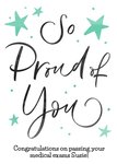 Front of card: So Proud Of You Card Black caligraphy surrounded by stars on a white background. Text reads: "So proud of you congratulations on passing your medical exams Susie!". 'Congratulations on passing your medical exams Susie!' can be personalised!