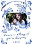 Front of card: Beautiful painted birds and flowers in blue, on a white background. There is a central photo frame, with handlettered text below. Text reads: "Have a blessed Yom Kippur."