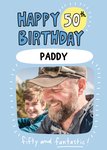 Front of card: 50th Birthday Photo Upload Card Bold and blue with fun typography. Text reads: "Happy 50th birthday Paddy" and "Fifty and Fantastic!". 'Paddy' can be personalised!