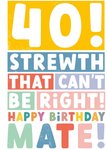 Front of card: 40th Birthday Card Bold typography stacked in colourful rectangles. Text reads: "40! Strewth that can't be right! Happy birthday mate!".