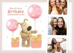 Front of postcard: A pastel cute card featuring Boofle standing holding a pink balloon, surrounded by presents. There is a photo strip to the right containing 3 photo areas.