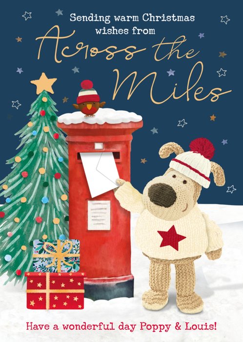 This Boofle greeting postcard design features the adorable knitted dog character, Boofle, holding a festive gift and surrounded by hearts, stars, and glitter accents, with a warm and heartfelt message, creating a cosy and charming atmosphere perfect for a special occasion.