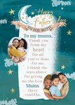 A central text verse is surrounded by 2 photo upload areas, stars and a Moon with a face, on a blue/green background.
