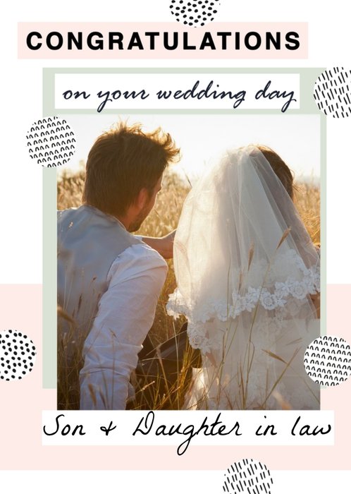 Front of card: Illustration of patterned circles on pink and white background with photo upload in center. Text reads: "Congratulations on your wedding day. Son & Daughter in law" With editable recipient.
