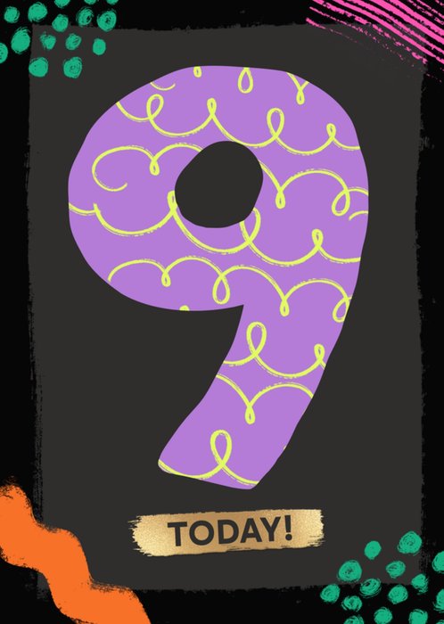 Front of card: A bright, vibrant design featuring a large purple'9' filled with looping lines surrounded by hand-painted lines and doodles. Underneath is a gold block with black text. The design sits on a two-toned black background. Text reads: "9 Today!".