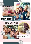 Front of card: Illustration of patterned circles and blocks of pink and dark green on white background with four photo upload options. Text reads: "Hip Hip Hooray You Did It"