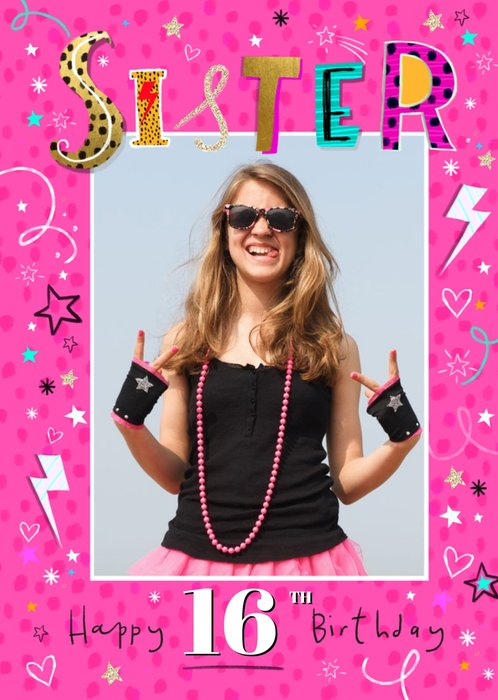 Bright Graphic Typographic Icons Sister 16 Today Multiple Photo Upload Birthday Card
