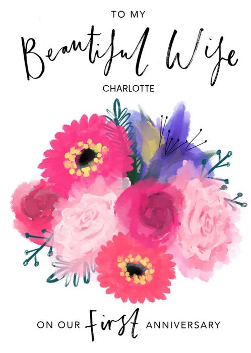 Bright Pink Watercolour Flowers To My Beautiful Wife On Our First Anniversary Card