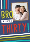 Front of card: Featuring colourful, hand-painted effect typography with one photo upload frame with a gold foil border. The card is adorned with decorative painted stripes in various colours against a blue background. It’s a personalised card celebrating a brother with enthusiasm and admiration.