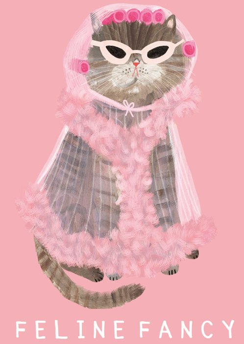 Featuring an illustration of a cat dressed in a fluffy cape with rollers in its fur, wearing sunglasses, with white typography at the bottom of the card, all on a pink background.