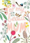 Front of card: Hand illustrated typography surrounded by illustrated floral pattern, birds and insects on white background. Text reads: "For my beaut Mum".