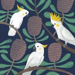 Three Illustrated cockatoos on a colourful floral banksia plant blue background.