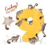 Large bold yellow number Nine typographic and 9 sugar gliders with an text on a white background.