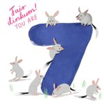 Large bold purple number Seven typographic and 7 bilbies with an text on a white background.