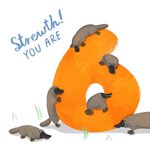 Large bold orange number Six typographic and 6 platypus's with an text on a white background.