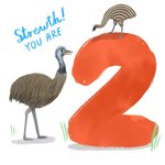 Large bold orange number two typographic and 2 emu's with an text on a white background.