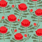 Illustrated of red flowers and leaves of the waratah planton green background.