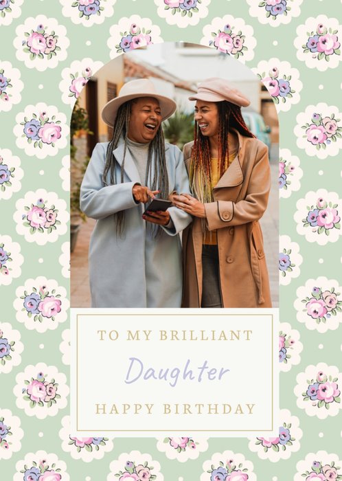 This vintage-inspired Cath Kidston design features an arched photo frame with a gold bordered text panel on a green floral patterned background.