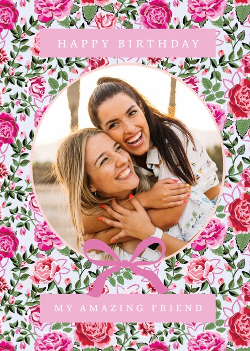 Featuring pink roses and green leaves on a pale grey greeting card with a large circular photo upload area in the centre and pink text banners.