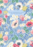 This greeting card design features a vibrant floral pattern of daisies, poppies, and other blooms in pastel tones of blue, pink, green, and yellow, set against a soft blue background. The text on the card reads, “To my wonderful wife on her Birthday.”