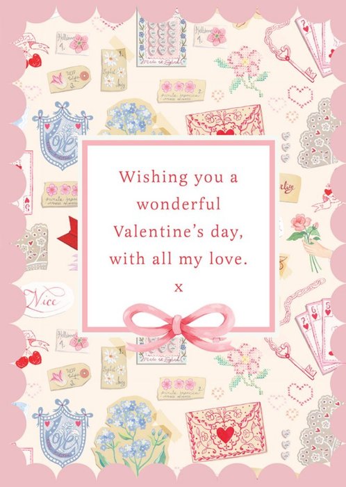 This classic Cath Kidston design features an elegant patterned background with a pink scalloped frame and a Valentine's Day message on a crisp white background.