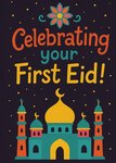 A colourful, modern design featuring an illustration of a mosque with crescent moon domes, stars and a floral motif on a black background.