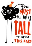 Chaotika bright and fun illustration featuring a scribble monster standing next to the typographic, non editable caption that reads You Must Be This Tall To Open This Card. The card background colour is white.