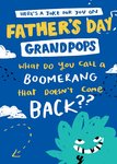 Front of card: Illustration of green monster on blue background with text Text reads: "Here's a joke for you on father's day grandpops what do you call a boomerang that doesn't come back??"