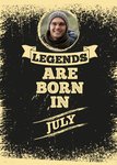 Front of card: Rustic, typography on distressed background with round photo upload at top of page. Text reads: "LEGENDS ARE BORN IN JULY" With editable photo