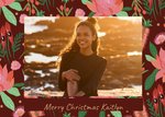 Front of card: Merry Christmas Card Features illustrations of flowers on a red-brown background surrounding a photo upload frame in the center of the card, with Gold text underneath in the middle of the card. Text reads: "Merry Christmas Kaitlyn". All text is editable.