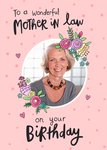 Front of card: Mother-In-Law's Photo Upload Birthday Card Circular photo frame decorated with flowers on a pink background. Text reads: "To a wonderful Mother-in-law on your birthday".