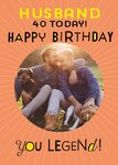 Front of card: You Legend! Photo Upload Birthday Card Circular photo frame on an orange burst background. Text reads: "Husband 40 today! Happy birthday you legend!". 'Husband 40 today!' can be personalised!