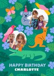 Front of card: Jungle Themed Photo Upload Birthday Card Circular photo frames surrounded by animals and flowers. Text reads: "Happy birthday Charlotte". 'Charlotte' can be personalised!