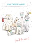 Front of card: Illustration of dogs holding bindle bags on a white polka dot background Text reads: "Bon Voyage Lauren You'll Be Missed". With editable text.