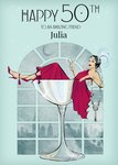 Front of card: Illustration of a1920's Flapper Girl in a martini glass with window and city view behind Text reads: "Happy 50th to an amazing friend Julia". With editable text.