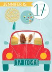 Front of card: 17th Photo Upload Birthday Card Illustration of a red car with photo upload and text. Text reads: "Jennifer is 17. 17 TODAY". Editable name.