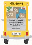 Front of card: Cute Illustration of a moving van filled with boxes and a cat Text reads: "New home. Emma & James enjoy every moment in your wonderful new home love Josie.". With editable text.
