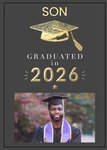 Front of card: Featuring one photo upload area in the centre bottom half of the design with text above it, amongst the text there is an illustrated mortarboard graduation cap.