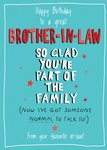 Front of card: Typographic Design on a blue background Text reads: "Happy Birthday To A Great Brother In Law So Glad You're Part Of The Family Now I've Got Someone Normal To Talk To From Your Favourite In Law" With editable text.