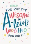 Front of Card: Illustrated colourful confetti with typographic text in center. Text reads: Bethany you put the Awesome in A-levels. Woo Hoo you did it! With customisable name.