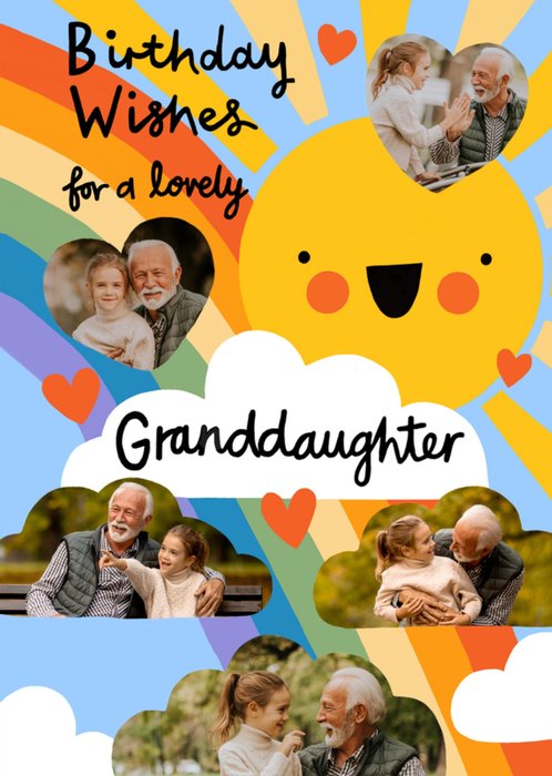 Featuring a smiling sun and clouds with colourful rainbow rays, orange and red heart shapes, and several photo spaces on a multi-coloured background.