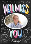 Front of Card: Colourful chalk typography on black background, with white illustrative borders, and photo in center. Text reads: WE'LL MISS YOU Stacey! With customisable name and photo upload.