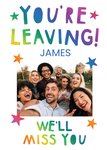 Front of card: You're Leaving! Photo Upload Card Colourful typography and stars on a white background. Text reads: "You're leaving! James we'll miss you". 'James' can be personalised!