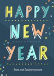 Front of card: Happy New Year Card Colourful typography on a blue background. Text reads: "Happy new year from our family to yours". 'From our family to yours' can be personalised!