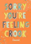 Front of card: Get Well Soon Card Colourful typography on an orange background. Text reads: "Sorry you're feeling crook Daniel". 'Daniel' can be personalised!