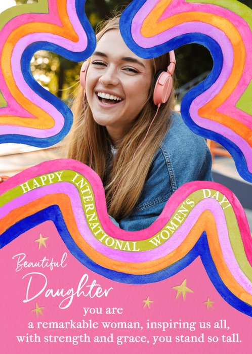 A vibrant, fun and bold International Women's Day card featuring one photo upload area inside a colourful abstract, wavy stiped shape in the top half of the card, in the background there are gold stars.