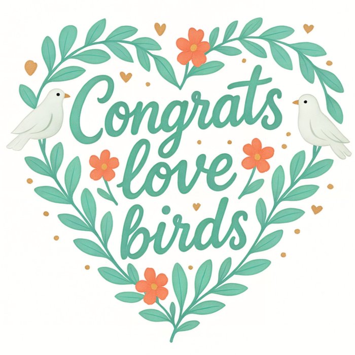 Featuring a white greeting card with a heart-shaped wreath of green leaves and orange flowers, with two white birds facing each other in the centre.