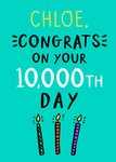 Featuring a bright turquoise greeting card with bold hand-drawn lettering and three colourful candles near the bottom on a plain teal background.