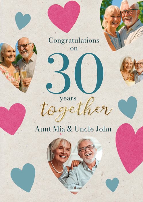 This greeting card displays five heart-shaped photo frames with an elderly couple, pink and blue heart illustrations, and central congratulatory message on a light textured background.